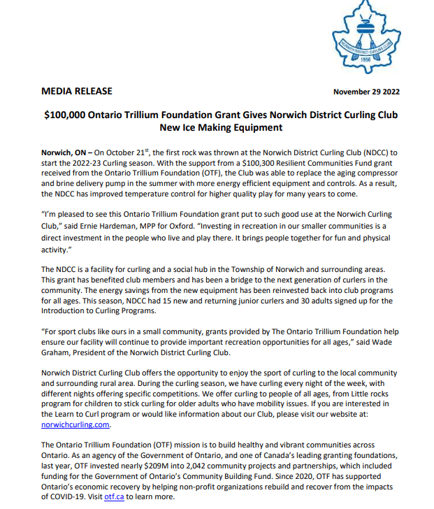 The Norwich District Curling Club wish to acknowledge the generous support of the Ontario Trillium Foundation in support of Curling in the Village of Norwich and surrounding areas.